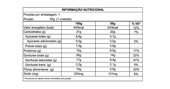 INGREDIENTES: Recheio proteico sabor chocolate (concentrado proteico de soro de leite, gordura vegetal, cacau em pó natural, leite em pó desnatado, liquor de cacau, estabilizantes maltitol e polidextrose, emulsificante lecitina de soja* e aromatizante), biscoito sabor baunilha (amido de milho, farinha de arroz branco, gordura vegetal, amido pré gelatinizado, fermento químico bicarbonato de sódio, sal hipossódico, estabilizantes maltitol, polidextrose e goma guar, emulsificante lecitina e edulcorante glicosídeos de esteviol de Stevia rebaudiana Bertoni) e cobertura sabor chocolate ao leite (gordura vegetal, soro de leite em pó, leite em pó integral, estabilizantes polidextrose e maltitol, emulsificantes lecitina de soja* e poliglicerol polirricinoleato e aromatizante idêntico ao natural). ALÉRGICOS: CONTÉM DERIVADOS DE SOJA E LEITE. PODE CONTER AVEIA, OVOS, AMENDOIM, AVELÃS, CASTANHA-DE-CAJU, CASTANHA-DO- BRASIL, MACADÂMIAS, NOZES E PISTACHES. CONTÉM LACTOSE. NÃO CONTÉM GLÚTEN.