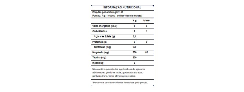 Ingredientes: Mix de mineral, aminoácido e nutrientes (mio-inositol, bisglicinato de magnésio, taurina, L-triptofano e antiumectante dióxido de silício), limão em pó, espirulina azul (Arthrospira platensis), chá solúvel de camomila, chá solúvel de maracujá, lavanda em pó, acidulante ácido cítrico, aromas naturais (limão, extratos de erva cidreira, lúpulo e melissa) e edulcorante glicosídeos de esteviol de Stévia rebaudiana Bertoni.