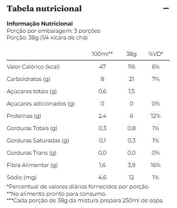 Ingredientes: Batata desidratada, arroz basmati, quinoa branca, lentilha rosa, abóbora desidratada, cebola desidratada, frango desfiado desidratado, cenoura desidratada, alho desidratado, tomate desidratado, cúrcuma em pó, salsa, orégano e coentro em pó.