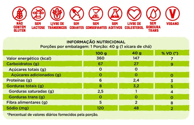 Não contém glúten | Zero lactose | Produto Vegano | Certificado Kosher | Certificado ABV Vegano