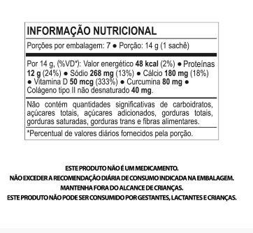 Ingrredientes: Colágeno hidrolisado, cálcio derivado de Lithothamnion calcareum, salsa em pó, coouve em pó solúvel, sal solúvel, sal (cloreto de sódio), extrato de rizomas de cúrcuma ( Curcuma longa l), colágeno de frango com colágeno tipo II não desnaturado, vitamina D3 ( colecalciferol), aroma idêntico ao natural de frango, corante betacaroteno e antiumectante dióxido de silício.