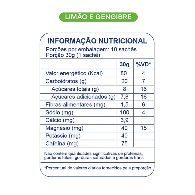 Ingredientes: Maltodextrina, água, glicose de milho, beterraba em pó, xarope de maçã, limão em pó, guaraná em pó, gengibre em pó, acerola em pó, água de coco em pó, acidulante ácido cítrico, cloreto de sódio, bisglicinato de magnésio, fosfato de potássio, aroma natural de limão, edulcorante glicosídeos de esteviol, conservantes benzoato de sódio e sorbato de potássio e sequestrantes EDTA cálcio dissódico.