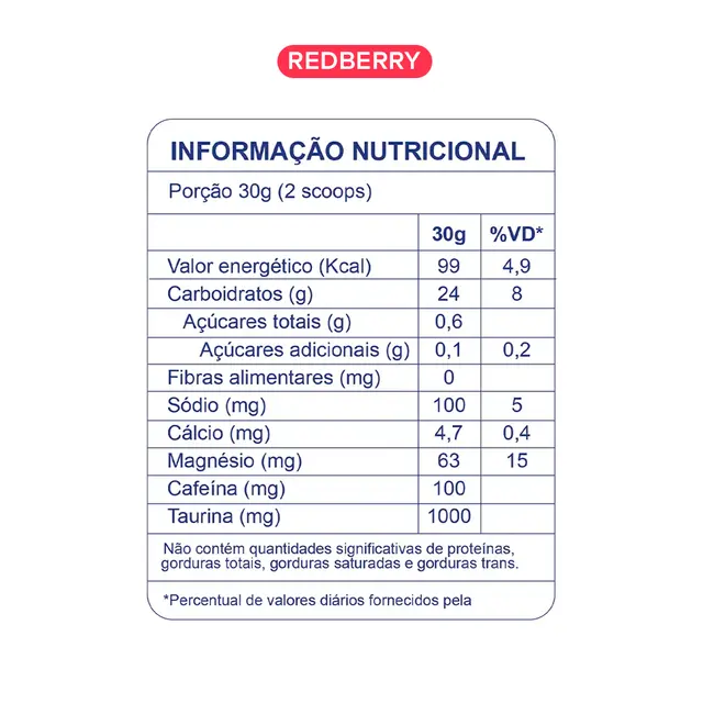 Ingredientes: Maltodextrina, beterraba em pó, taurina, bisglicinato de magnésio, guaraná em pó, limão em pó, frutas vermelhas em pó (morango, framboesa e cranberry), estabilizante citrato trissódico, água de coco em pó, acerola em pó, gengibre em pó, acidulante ácido cítrico, aroma idêntico ao natural de frutas vermelhas, edulcorante estévia.