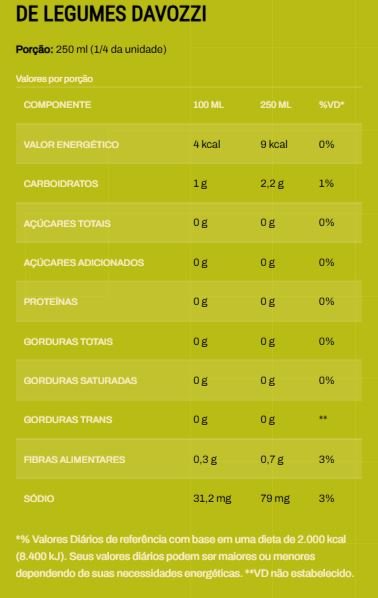 Feito com ingredientes 100% naturais, o Caldo de Legumes Davozzi é o equilíbrio perfeito entre leveza e sabor. Cebola, cenoura, aipo, alho-poró, tomate, ervas e especiarias se unem para criar um caldo puro, aromático e cheio de vida — como se tivesse acabado de sair da panela da sua avó. Ingredientes 100% Naturais todos eles in natura, sabor quem vem da terra, caldo vegano, mais sabor, menos tempero, baixo sódio, para dietas especiais, sem glúten e sem lactose.