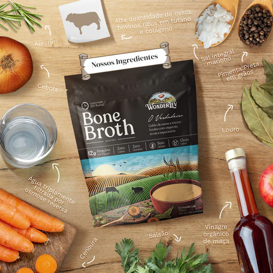 Ingredientes: água, ossos bovinos, cenoura, cebola, salsão, vinagre de maçã, sal integral, alecrim e louro.