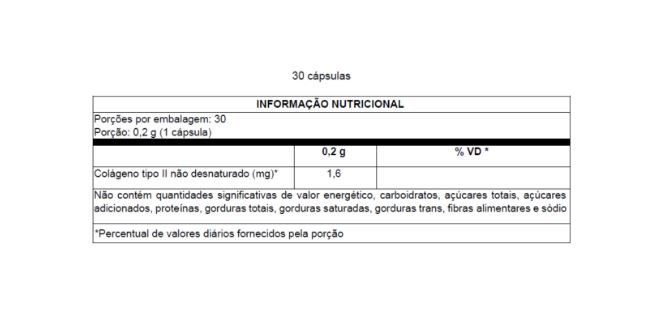 Ingredientes: Colágeno de frango com colágeno tipo II não desnaturado, (estabilizante) celulose microcristalina (gel de celulose), (antiumectante) dióxido de silício e (lubrificante) talco. Cápsula: (gelificante) gelatina e (corante) dióxido de titânio.