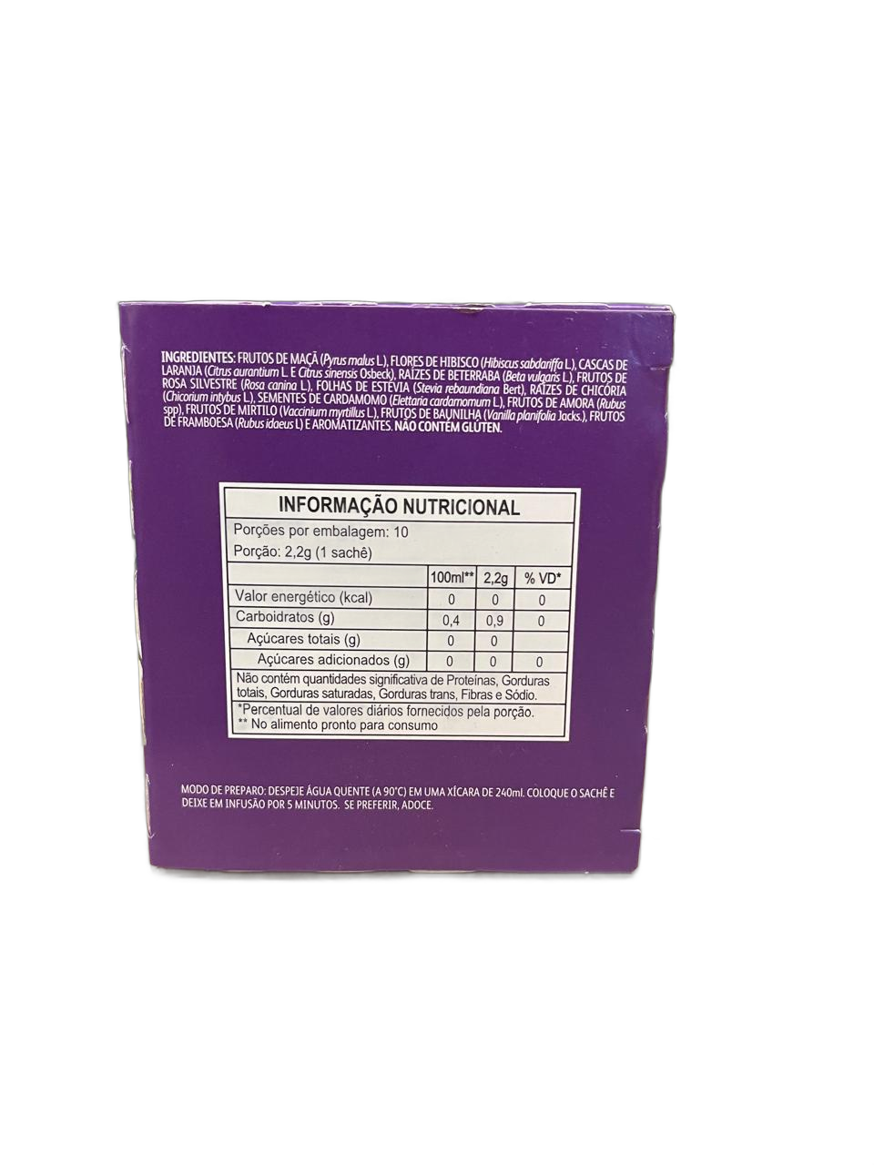 Ingredientes: Frutos de maçã, flores de hibisco, cascas de laranja, raizes de beterraba, frutos de rosa silvestre, folhas de estévia, raizes de chicória, sementes de cardamomo, frutos de amora, frutos de mirtilo, frutos de baunilha, frutos de framboesa, e aromatizantes.